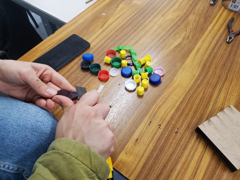 Nous avons également exploré le lien entre l’impression 3D et le recyclage du plastique : les participants ont d’abord fabriqué du filament à partir de bouteilles en plastique, puis matérialisé certaines pièces du tangram à l’aide de l’imprimante 3D.